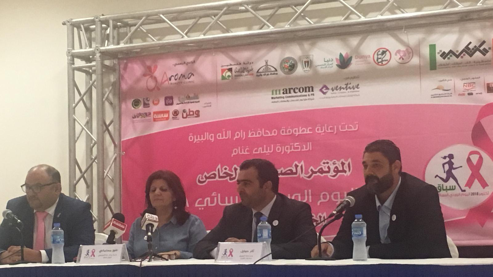 نظمت مؤسسة لجان العمل الصحي/ دنيا المركز التخصصي لأورام النساء وشركة إيفنتف للعلاقات العامة وشركة ماركوم للخدمات والعلاقات العامة وبنك فلسطين مؤتمراً صحفي للإعلان عن موعد السباق الوردي النسائي في نسخته الثالثة وذلك ضمن فعاليات شهر التوعية عن سرطان الثدي والتي إنطلقت أوائل الشهر الجاري تحت شعار "الكشف المبكر .. حياة" وذلك بحضور الرعاة والداعمين للسباق.