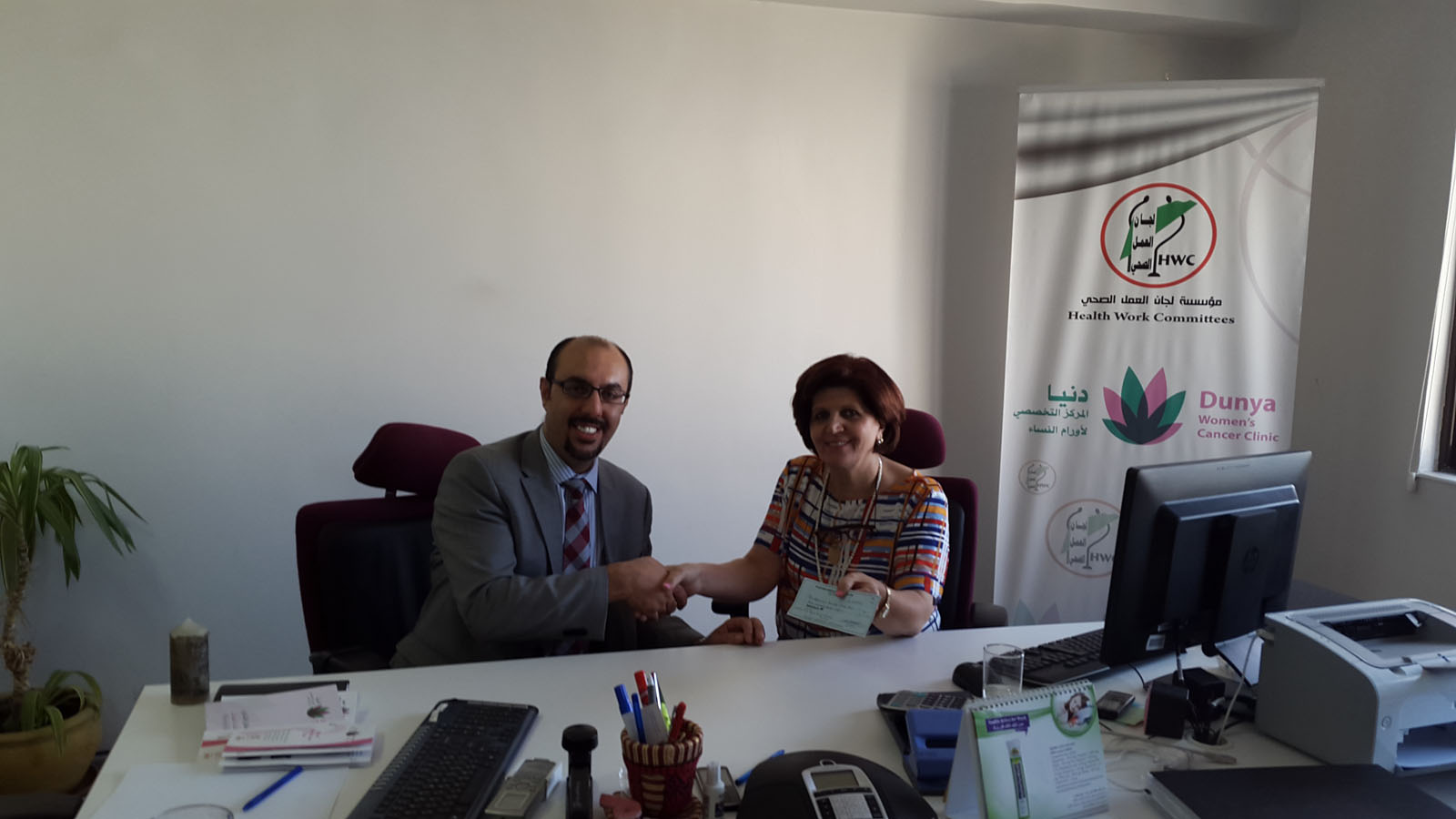 وقد ابدى د. حمارشة إهتمامه الشخصي وإهتمام الجمعية بهذا المجال وسعيهم للمساهمة في زيادة الوعي له في المجتمع الفلسطيني، الأمر الذي دفعهم للبحث عن المؤسسات العاملة في المجال وكانت مؤسسة لجان العمل الصحي ومركز دنيا في الواجهة.
