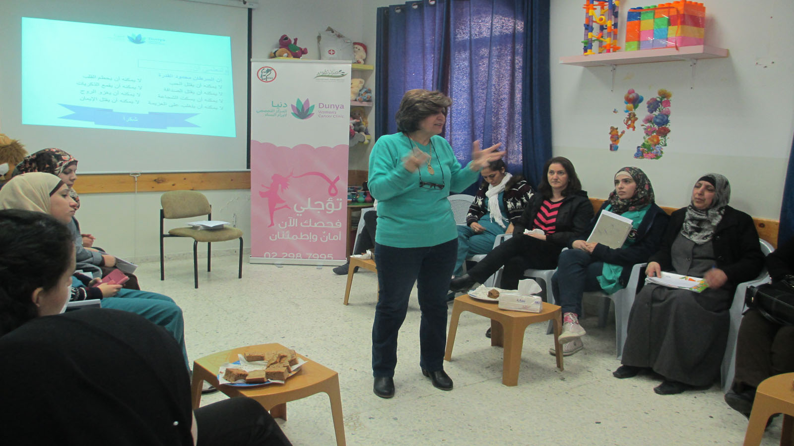 Dr. Maslamani-The Director of Dunya’s center talked about Breast Cancer, its symptoms, and the ways to detect it early. She focused on the importance of the manual self examination, in which women can detect any change in their breast and that is the first step in fighting the disease.