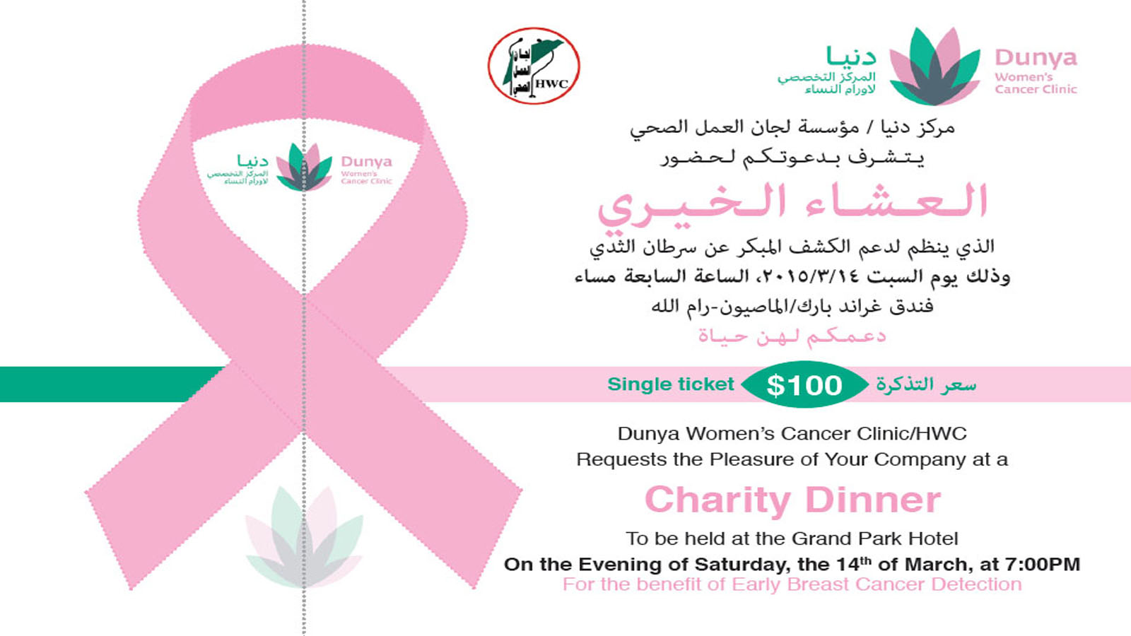 Dunya Women’s Cancer Clinic/Health Work Committee would like to invite you to a Charity Dinner for the benefit of Early Breast Cancer Detection. The Charity Dinner will strengtheour communication with the society that assists Palestinian Women fight Breast Cancer.